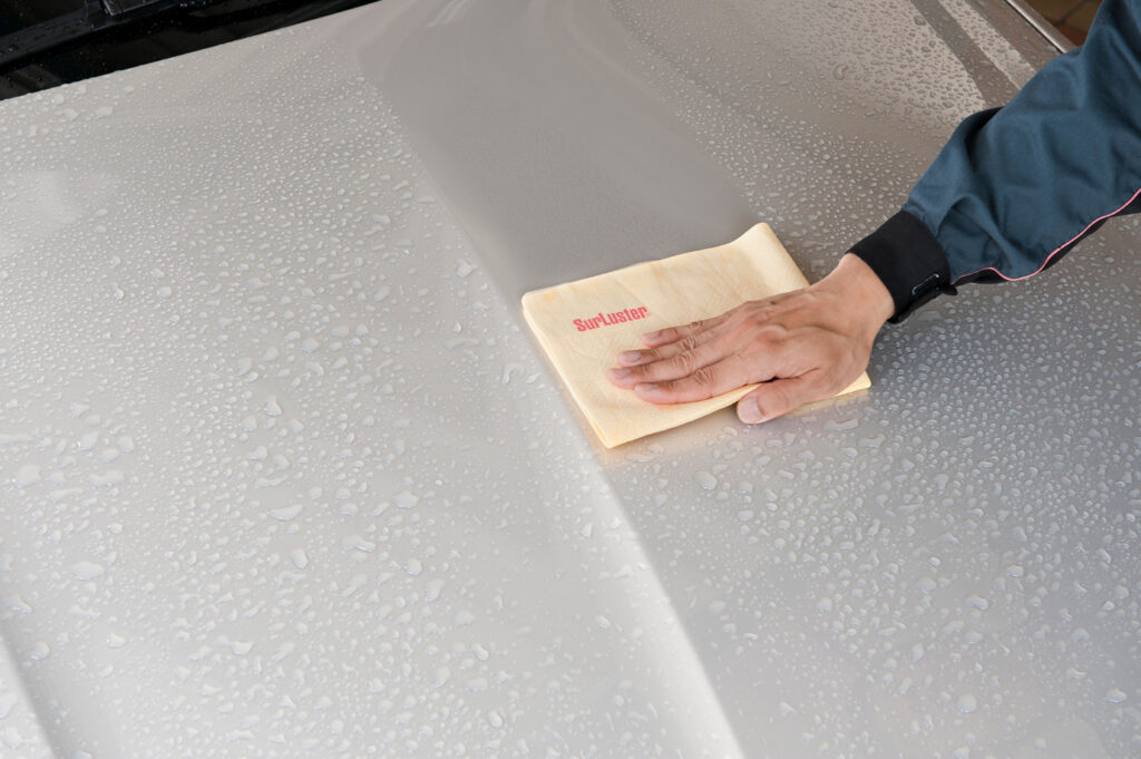 Water droplets left to air-dry create water spots and mineral stains. Quickly and carefully dry the entire vehicle using a high-absorbency microfiber drying towel or drying cloth. Wipe in one direction for streak-free results, working section by section until no water remains.